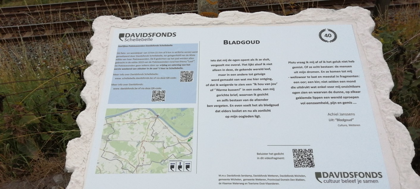Langsheen de route vind je 9 panelen waarop een gedicht te lezen staat dat tijdens de laatste Poëzieavonden van Davidsfonds Schellebelle werd gebracht. Je kan het gedicht ook beluisteren via de QR-code die naar een video-opname verwijst.